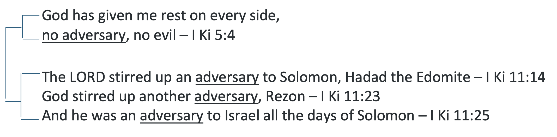 After forty years as king of Israel, the extraordinary power and wealth of Solomon is being threatened for the first time. Trading his wisdom for foolishness, God’s favor has now turned from Solomon as he began to worship the gods of his many wives (I Kings 1:4-11). To crumble his kingdom, God sends three adversaries—Hadad, Rezin, and Jeroboam. A note, worthy to highlight, is that the beginning and end of Solomon’s reign is framed with the word adversary: